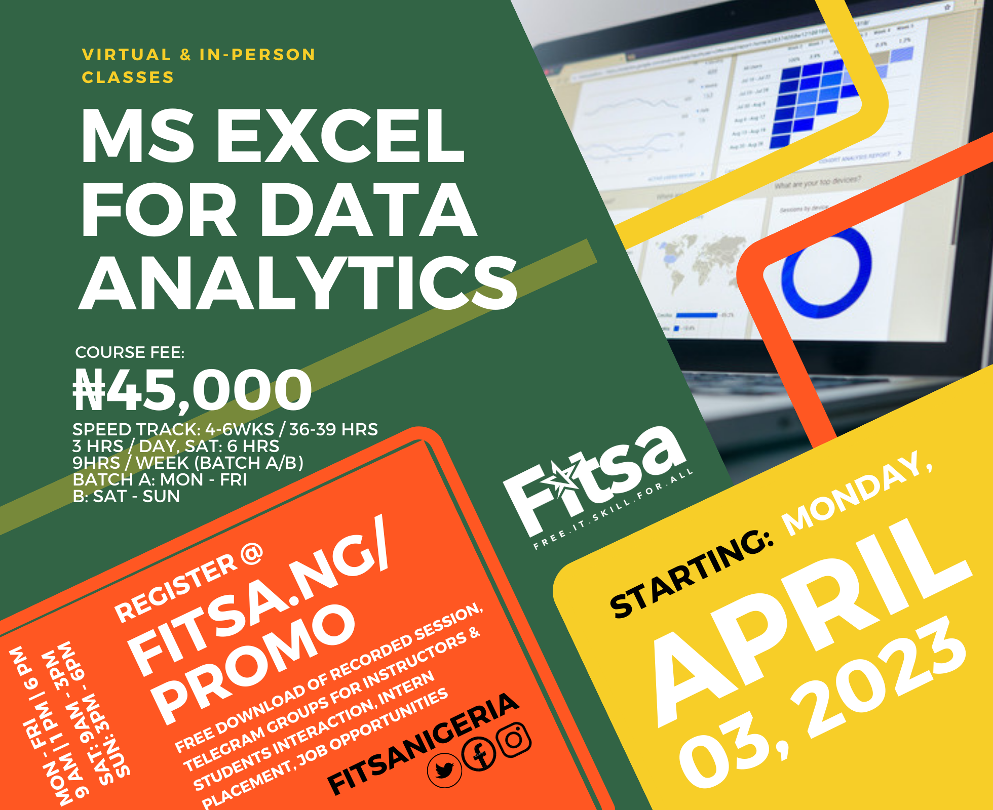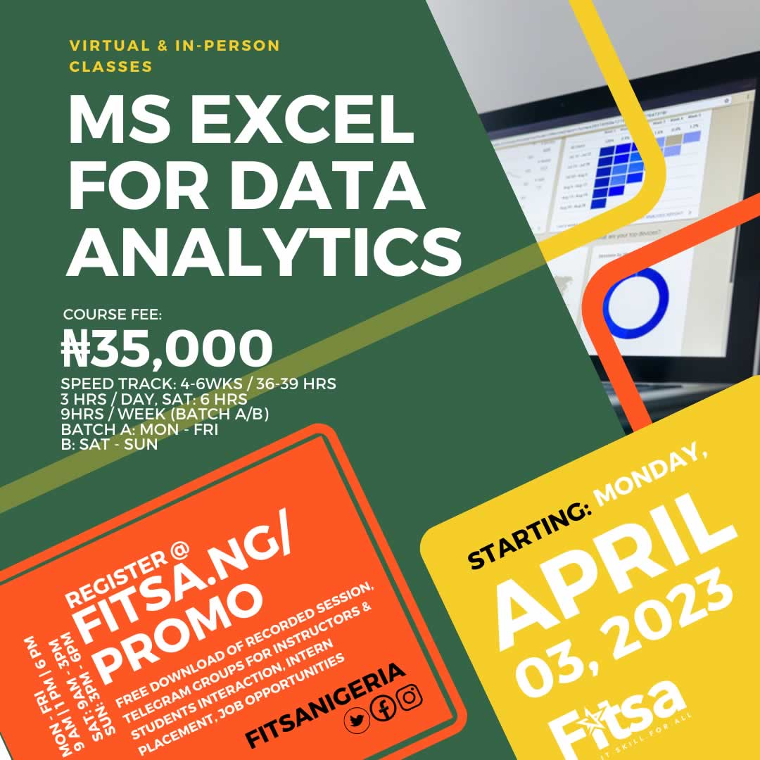 This course will cover advanced Excel skills and techniques that are specifically relevant to data analytics, such as importing and cleaning data, using advanced formulas and functions, data visualization, conditional formatting, and advanced functions, creating PivotTables and PivotCharts, and using Excel's advanced charting and graphing tools to create compelling and effective data visualizations.